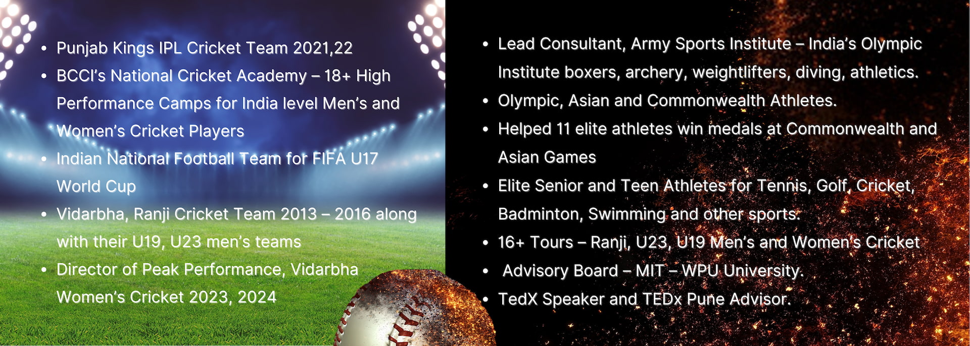 Starting when this profession did not even exist in India, he has worked with literally thousands of individual athletes and hundreds of professional team players across age groups, levels and sports disciplines.